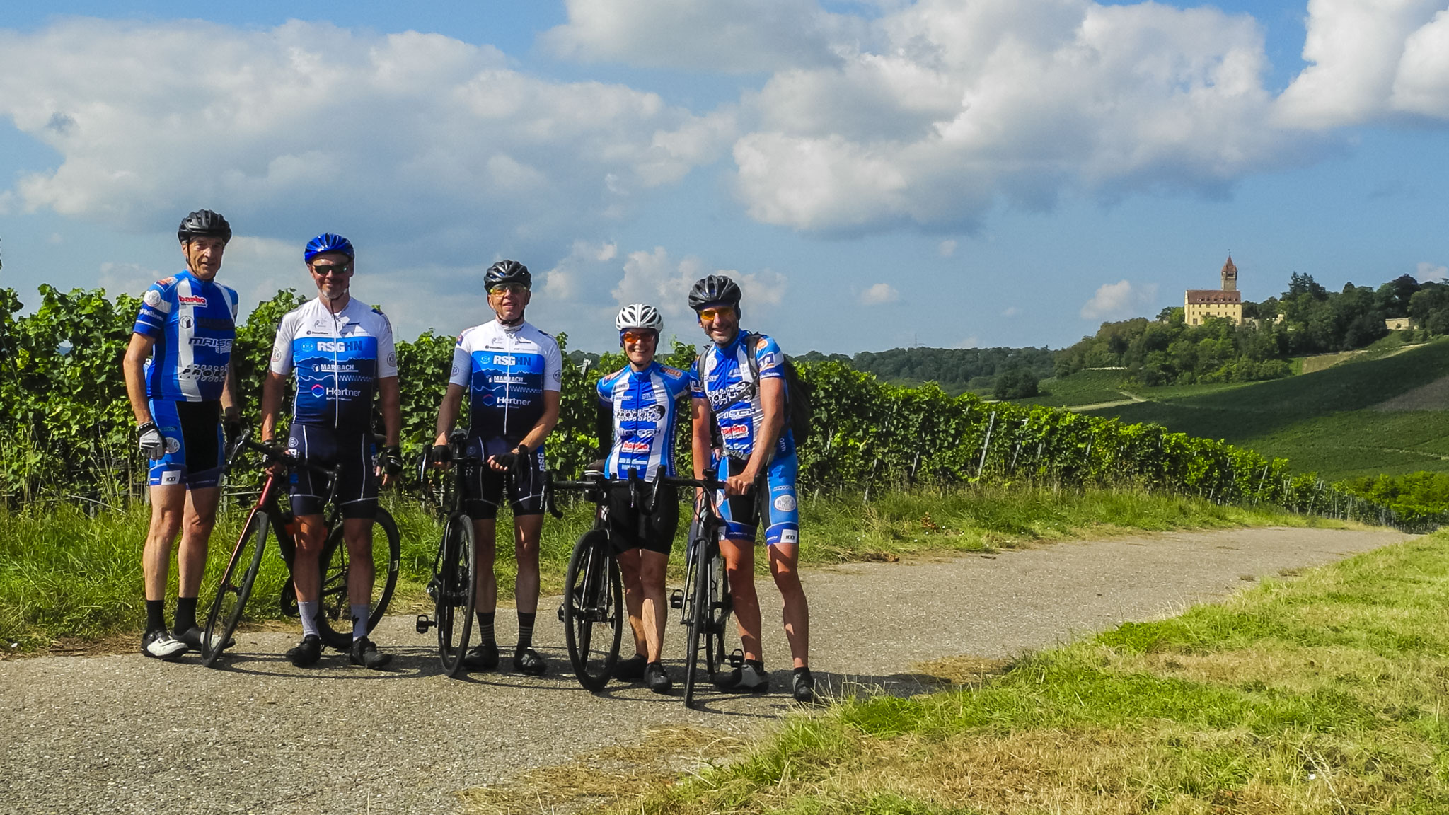 Von den ca. 15 versammelten Radlern, schlossen sich vier dem Guide der Gruppe 2 an. Das Ziel sollte das Zabergäu sein. Bei bestem Radlerwetter rollte die kleine Gruppe in Richtung Nordheim und Nordhausen, stadtauswärts. Über Wirtschaftswege wurde schnell Neipperg und das Haberschlachter Tal erreicht. Wo auch in den Weinbergen, oberhalb von Stockheim, das Gruppenfoto entstand. Über Frauenzimmern, Güglingen und Zaberfeld gelangte die Gruppe schnell nach Leonbronn, wo jetzt die Steigung, hinauf nach Ochsenburg, überwunden werden musste. Als Belohnung, folgte eine schöne Abfahrt hinunter nach Mühlbach. Für die komplette Rückfahrt wählte der Guide wieder Wirtschafts,- und Radwege. Diese führten von Eppingen, Gemmingen, Leingarten bis zurück ins Stadtgebiet von Heilbronn. Wieder am Bollwerksturm angekommen, standen 75 Km auf dem Tacho. GP