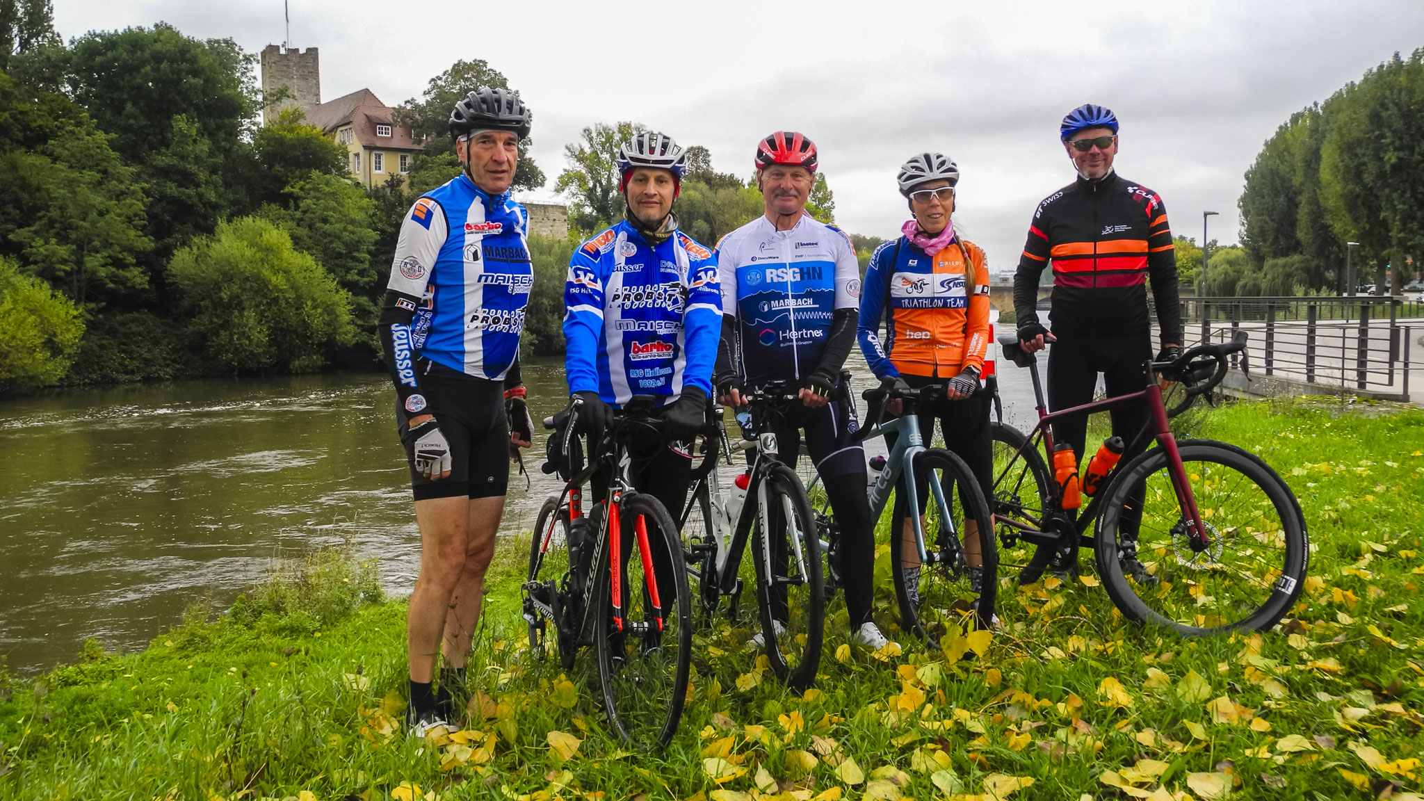 Vermutlich auf Grund der herbstlichen Witterung, hat sich die Anzahl der Mitfahrer eher gering gehalten. Zum Guide der Gruppe 3 gesellten sich lediglich vier weitere Radler. Diese verließen die Stadt über Badstraße und Neckartalradweg in Richtung Nordheim. In der leichten Steigung, entlang des Heuchelbergs, konnten sich die Radler warm fahren, was bei den kühlen Temperaturen auch nötig war. Weiter über Neipperg, Haberschlacht und Stockheim, erreichte die Gruppe, in Frauenzimmern, den Radweg Richtung Botenheim. Angesichts der nicht steigen wollenden Temperaturen, verkürzte der Guide die Strecke und bog nach Meimsheim ab. In Lauffen angekommen, stellte sich die Gruppe am Neckarufer zum schon obligatorischen Gruppenbild auf, bevor es, hoch durchs Städtle, weiter ging. Über das Industriegebiet „Vorderes Burgfeld“, führte der Weg weiter zum Landturm und über Talheim und Horkheim zurück nach Heilbronn. Gleichzeitig mit den restlichen Gruppen, kam Gruppe 3 nach ca. 55 Km wieder am Bollwerksturm an. GP