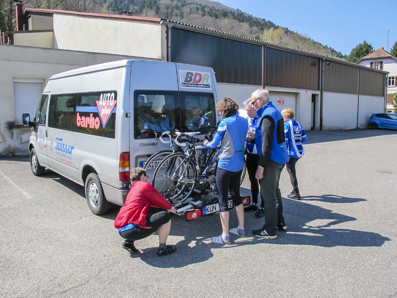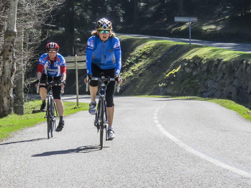 Am Sonntag riss dann endlich der Himmel wieder auf, die Sonne lachte und erwärmte die Luft. Mit den Rädern im Gepäck fuhren wir mit dem Vereinsbus nach Ribeauvillé im Elsass. Dort starteten wir unsere Bergtrainingseinheit über den Col de Foret de Ribeauvillé nach St Marie-aux Mines und weiter über den Col Bonhomme nach Kaysersberg. Mit verstauten Rädern im Gepäckabteil ging es wieder zurück zu unserer Pension in Endingen wo eine warme Dusche und vor allem ein leckere Torte auf uns wartete, bevor es wieder über die Autobahn heimwärts ging.