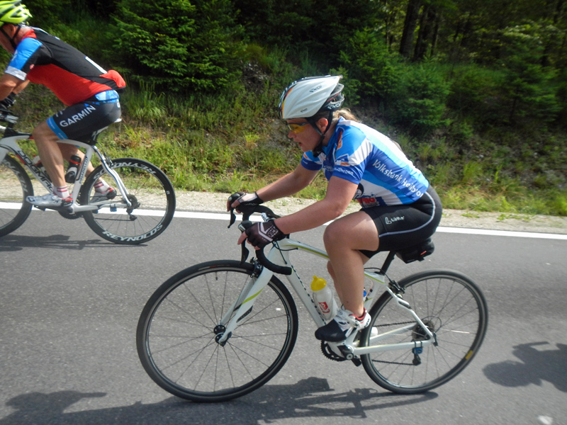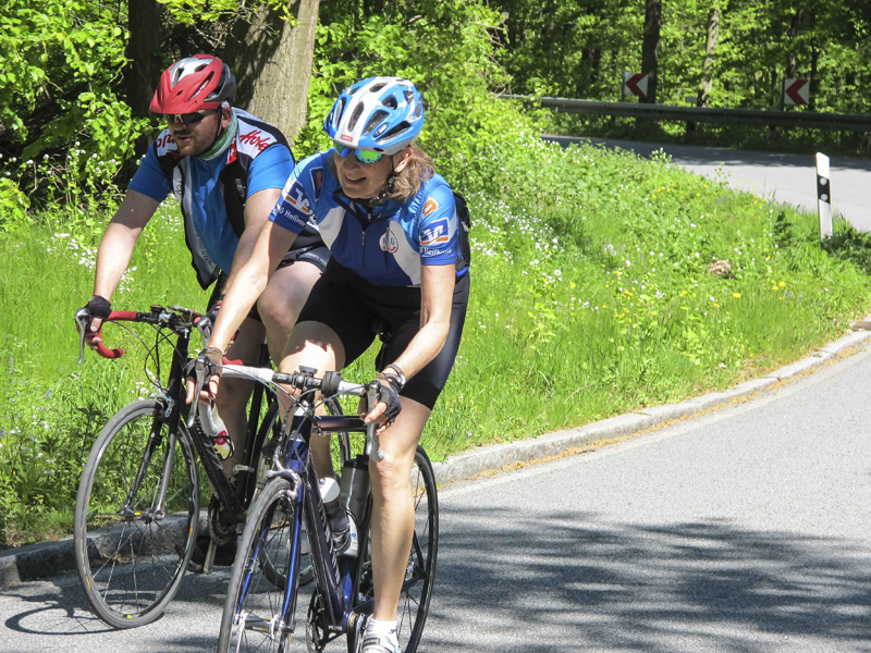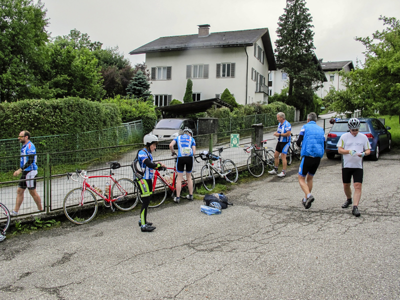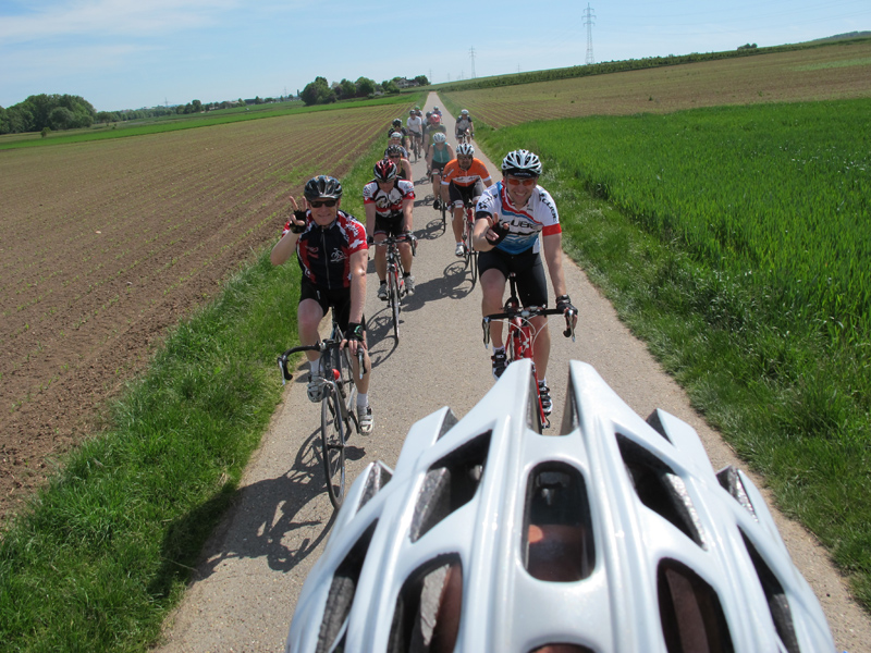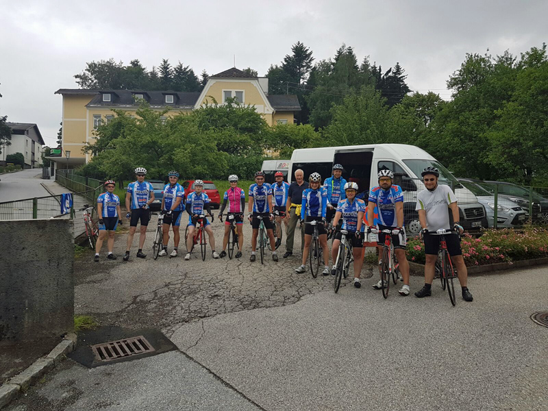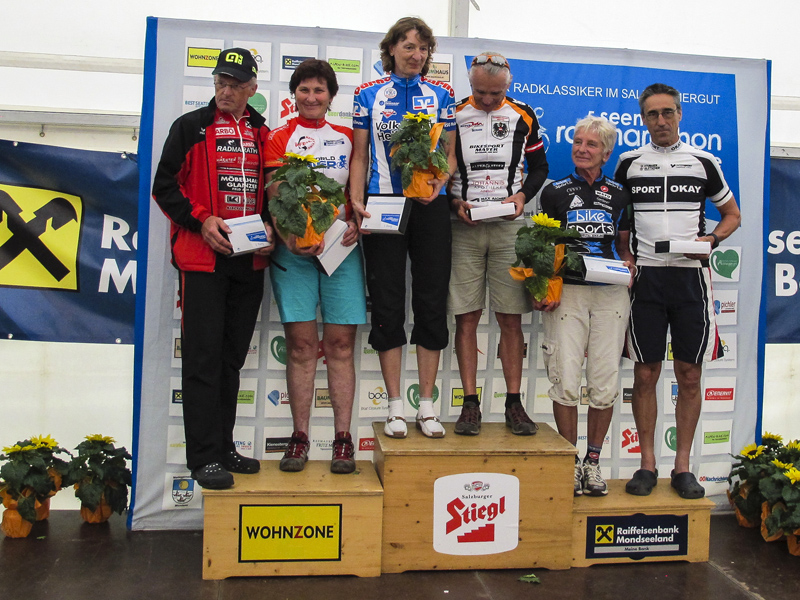 Am nächsten Morgen hat es dann aber zu regnen aufgehört und wir konnten uns nach einem ausgiebigen Frühstück an den Marathon heranwagen. Nach dem Warmfahren stellten wir uns im Startblock, getrennt nach Altersklassen, auf. Mit einem erneut einsetzenden Regenschauer gingen wir pünktlich um 8:25 Uhr die 75 Km an. Armin und Peter sind schon eine Stunde früher auf die 135 Km-Runde gestartet. In zügigem Tempo, jenseits der 35Km/h-Marke, wurden wir im Feld mitgezogen. Nach ca. 8 Km kam der erste selektive Anstieg und die Felder wurden auseinander gerissen. Wer bei der Abfahrt Glück hatte, hat eine schnelle Gruppe erwischt, mit der es zügig voran ging. In schnellen Tempo haben wir alle unfallfrei das Ziel erreicht. Die meisten RSG'ler hatten einen Schnit von 30Km/h und mehr erreicht, Gerti und Günter haben sogar die 36Km/h-Marke geknackt. Am Ende hat es aber leider nur für einen Stockerlplatzt (Siegertreppchen) gereicht. Gerti hat die AK 60 für sich entscheiden können und ist ganz oben auf dem Stockerl gestanden.